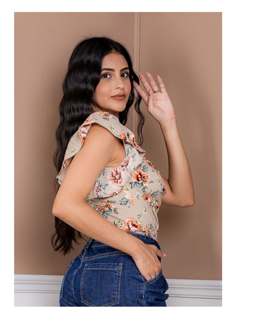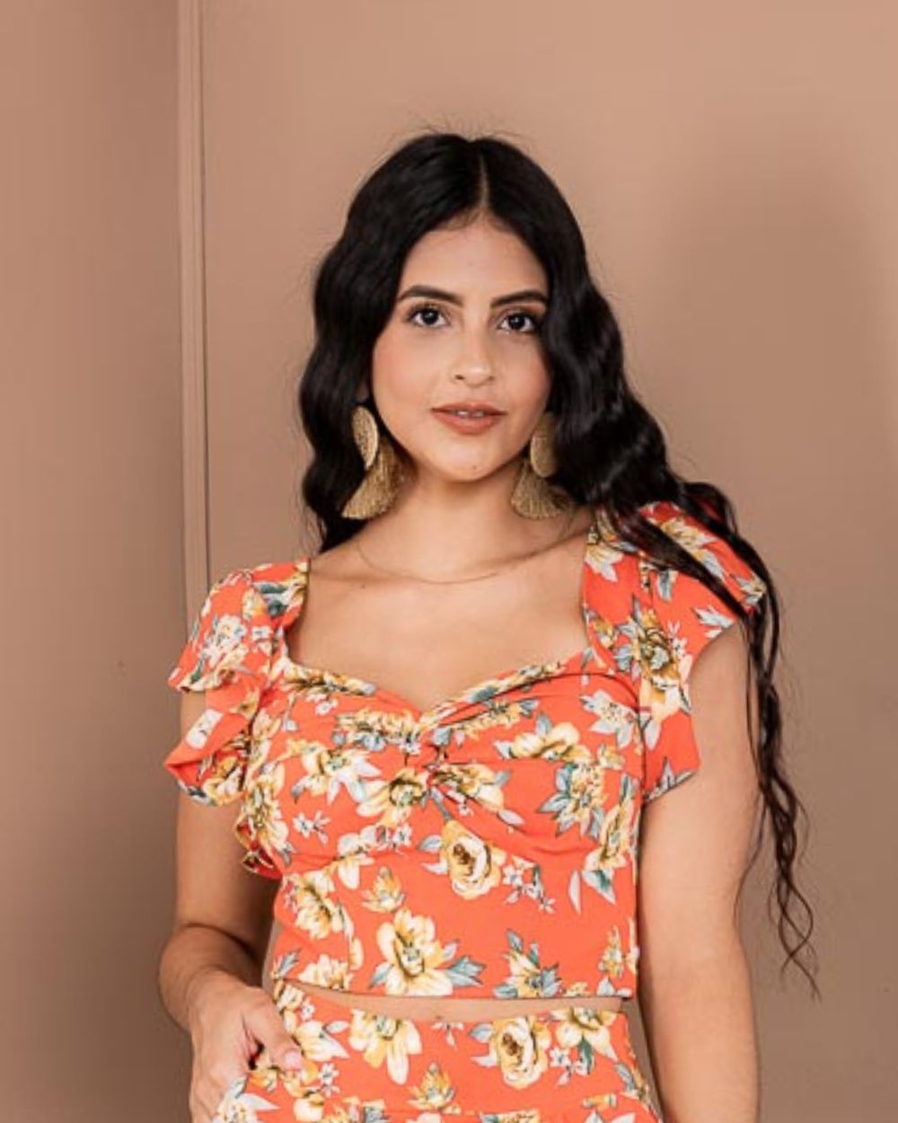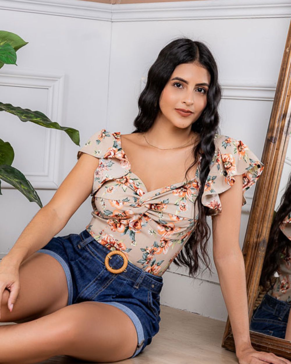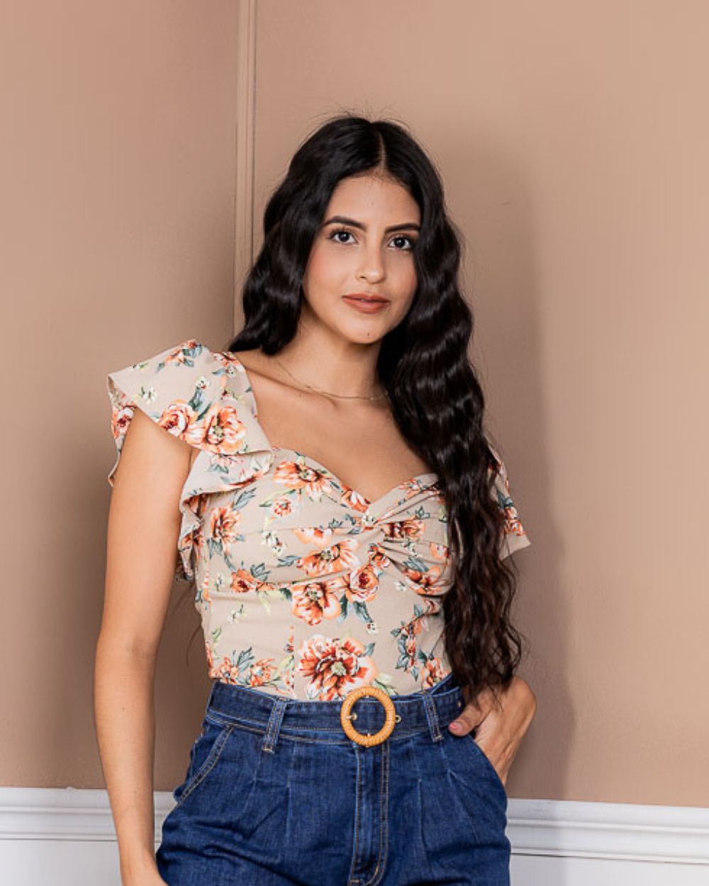Una prenda fresca y femenina con un estampado floral, diseñada con mangas cortas tipo volantes que aportan movimiento y delicadeza. Su escote en forma de corazón con fruncido central realza la silueta y brinda un toque romántico, ideal para looks veraniegos y llenos de estilo.