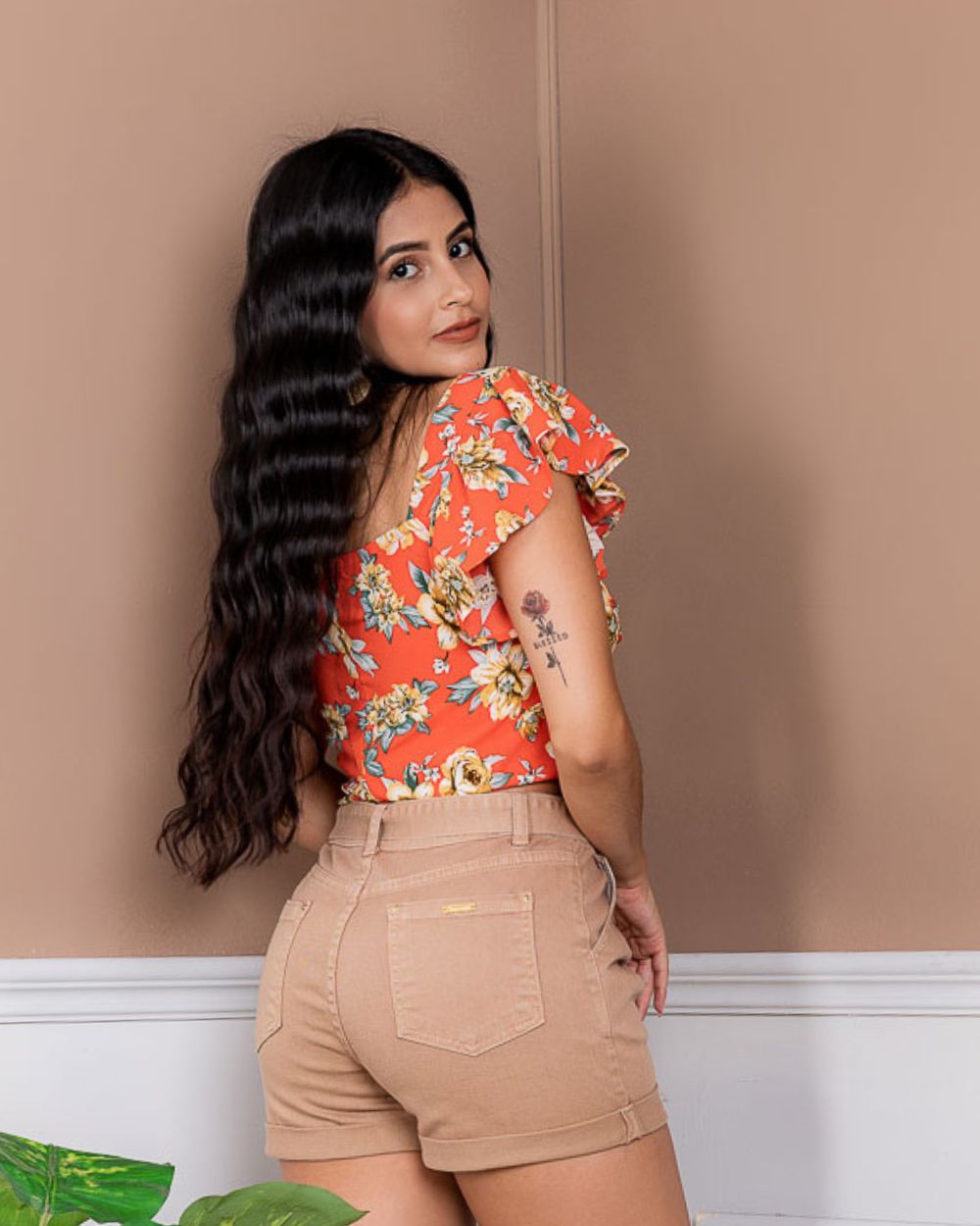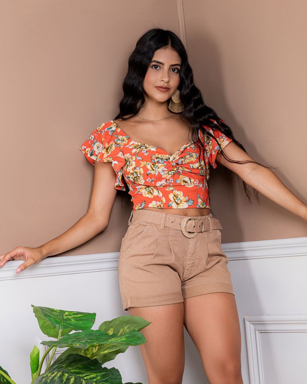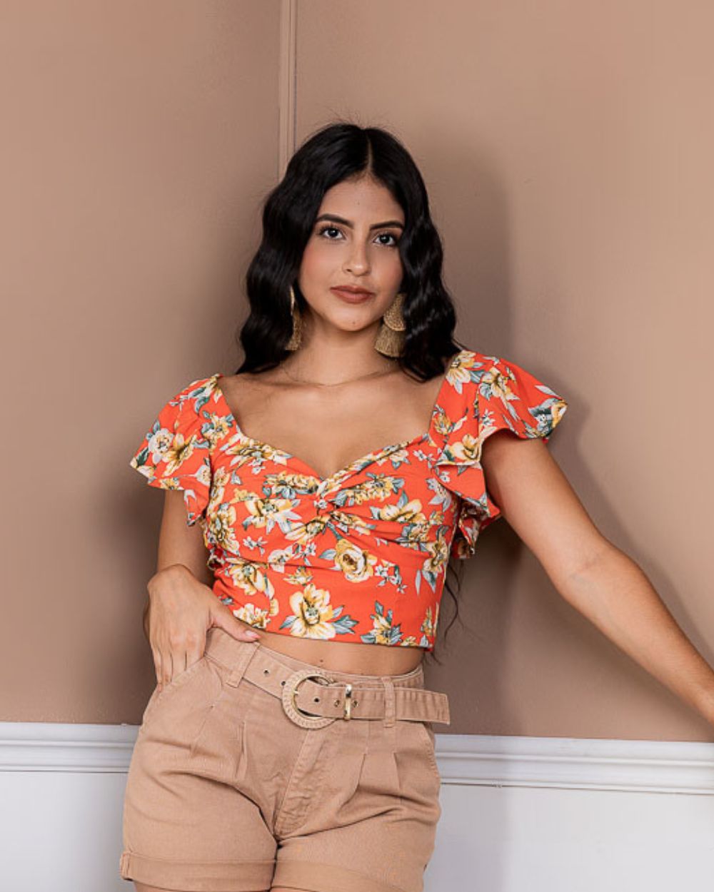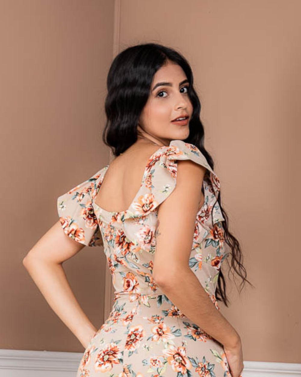 Una prenda fresca y femenina con un estampado floral, diseñada con mangas cortas tipo volantes que aportan movimiento y delicadeza. Su escote en forma de corazón con fruncido central realza la silueta y brinda un toque romántico, ideal para looks veraniegos y llenos de estilo.