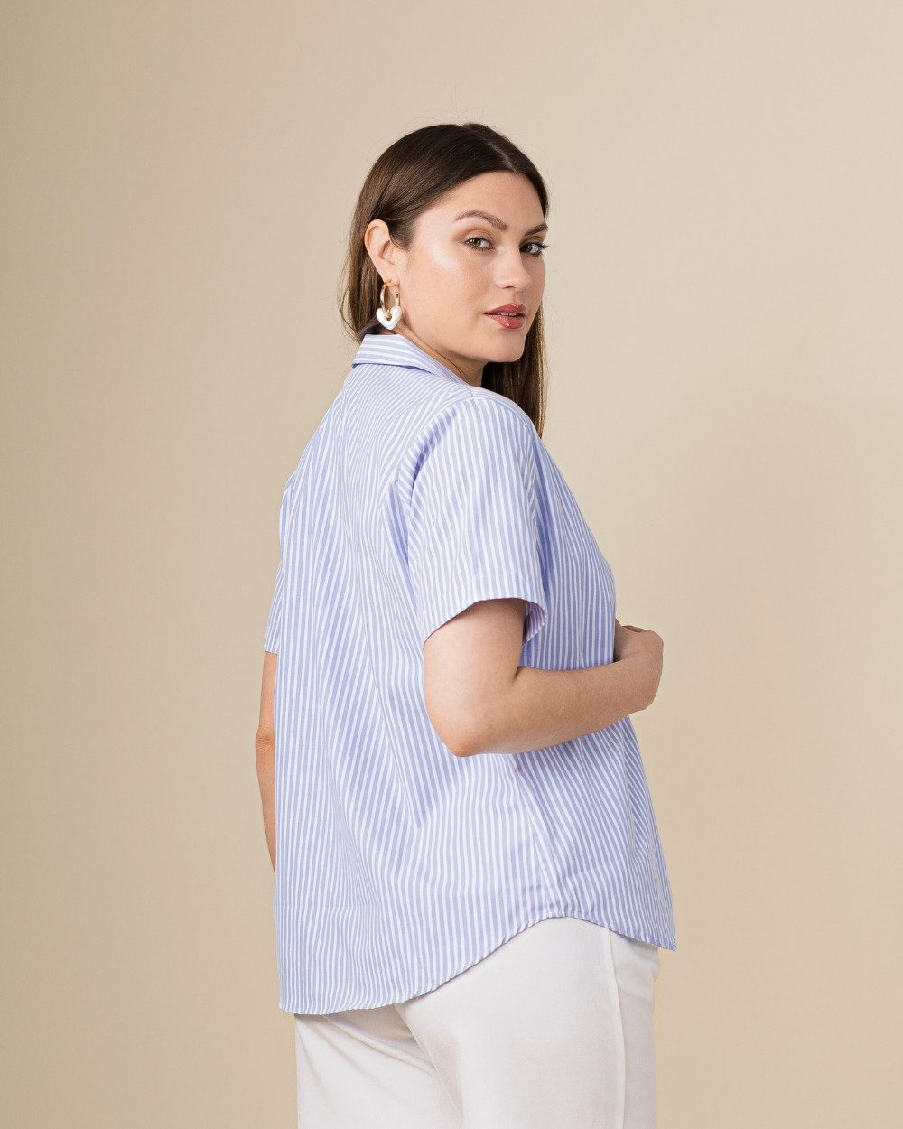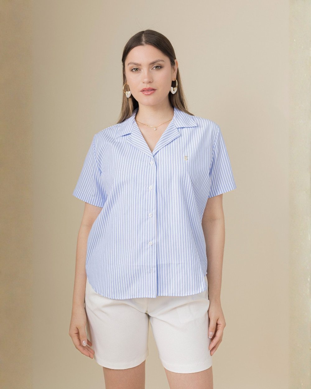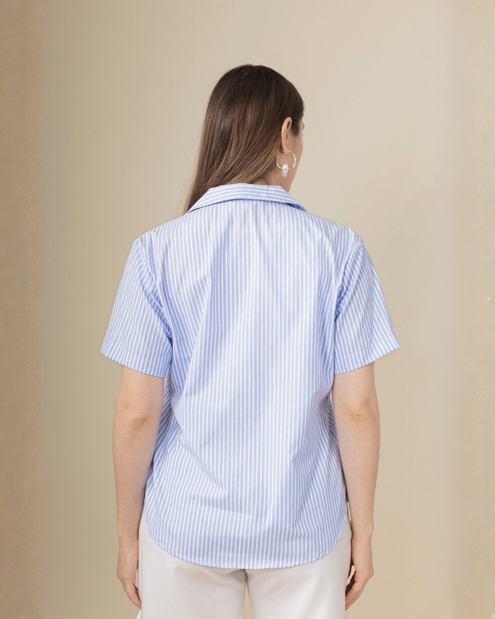 Confeccionada en tela rayón, la Blusa Estela destaca por su textura ligera y suave al tacto. Su estilo clásico con cuello y botones frontales aporta frescura y versatilidad, permitiéndote usarla tanto en un look casual como en uno más elegante.