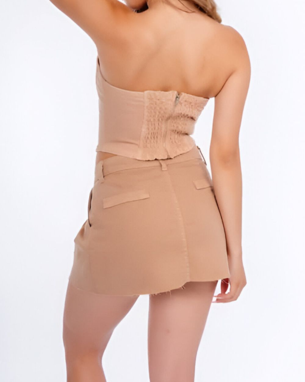 Una prenda con estilo fresco y juvenil, donde los pliegues aportan movimiento y la tela denim drill rígido le da estructura y firmeza para mantener una silueta definida.
