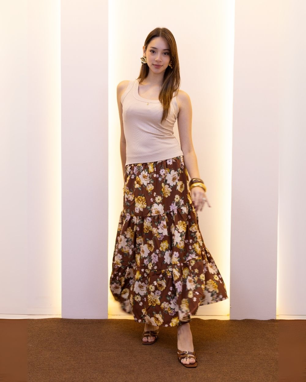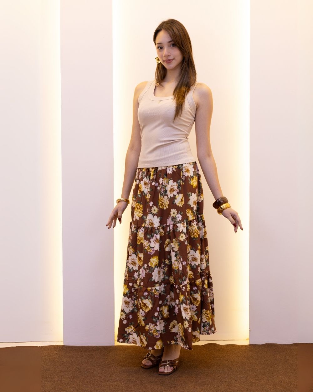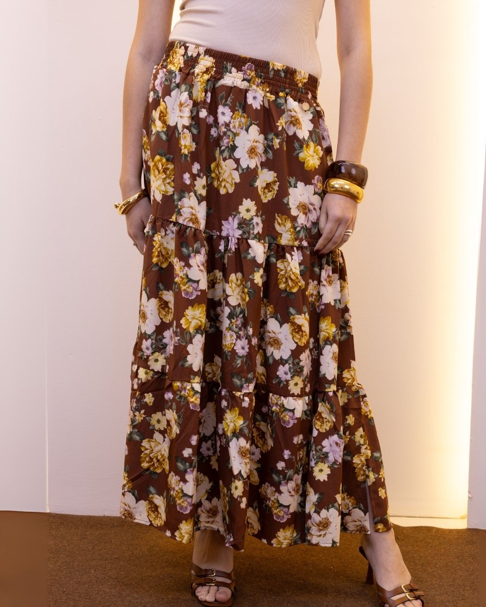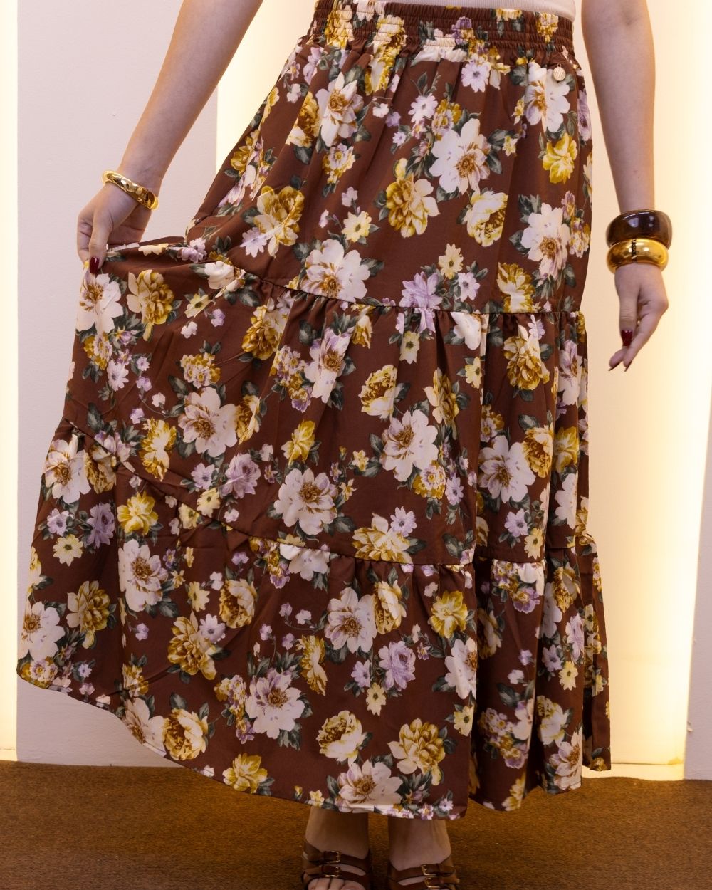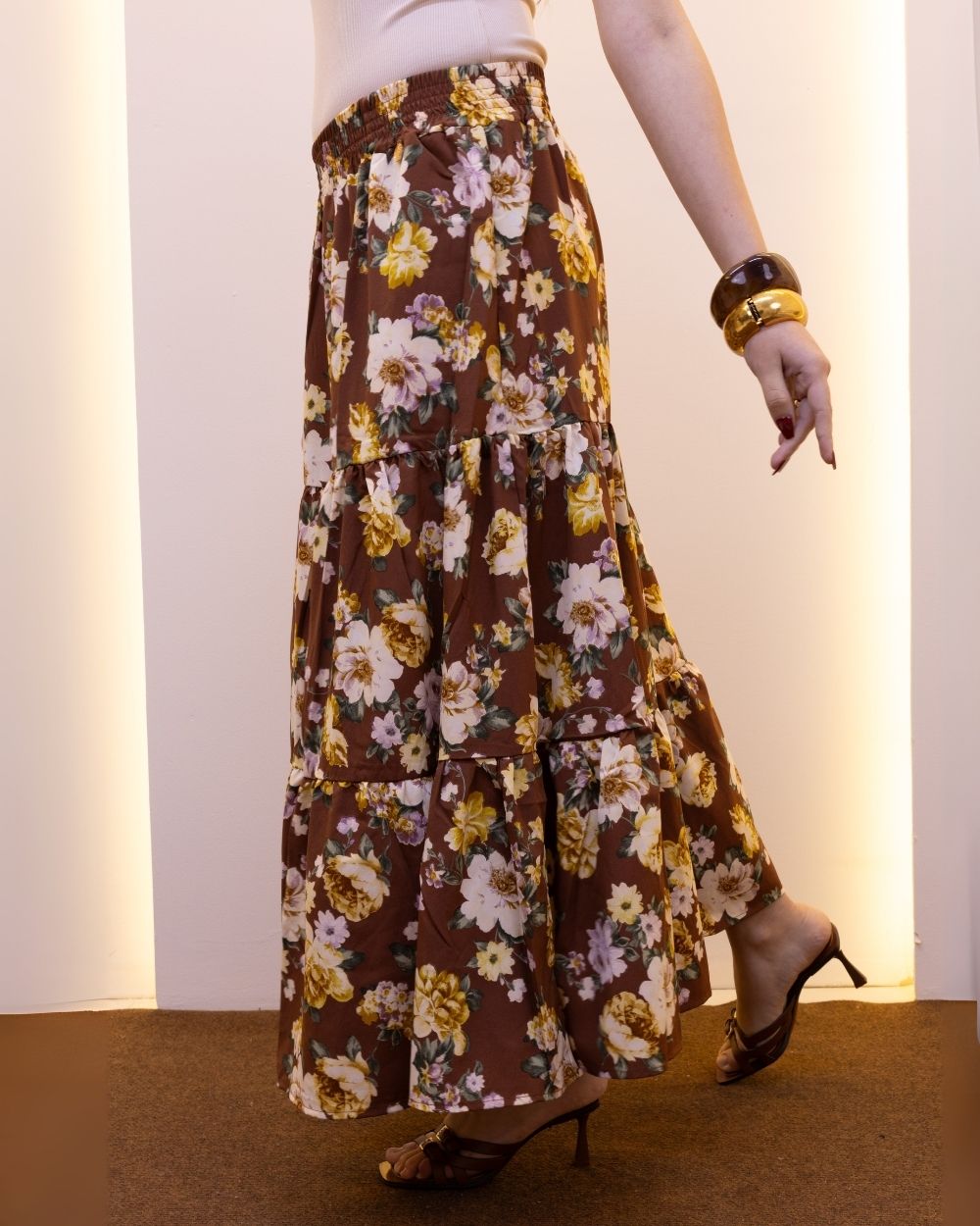 Confeccionada en seda francesa, esta falda aporta frescura y movimiento natural en cada paso. Su diseño en capas crea un efecto fluido y elegante, mientras que el elástico en la cintura asegura un ajuste cómodo que se adapta a tu silueta, resaltando la zona de la cintura sin perder libertad. El estampado floral la convierte en una pieza versátil para darle un aire femenino y romántico a tu look.