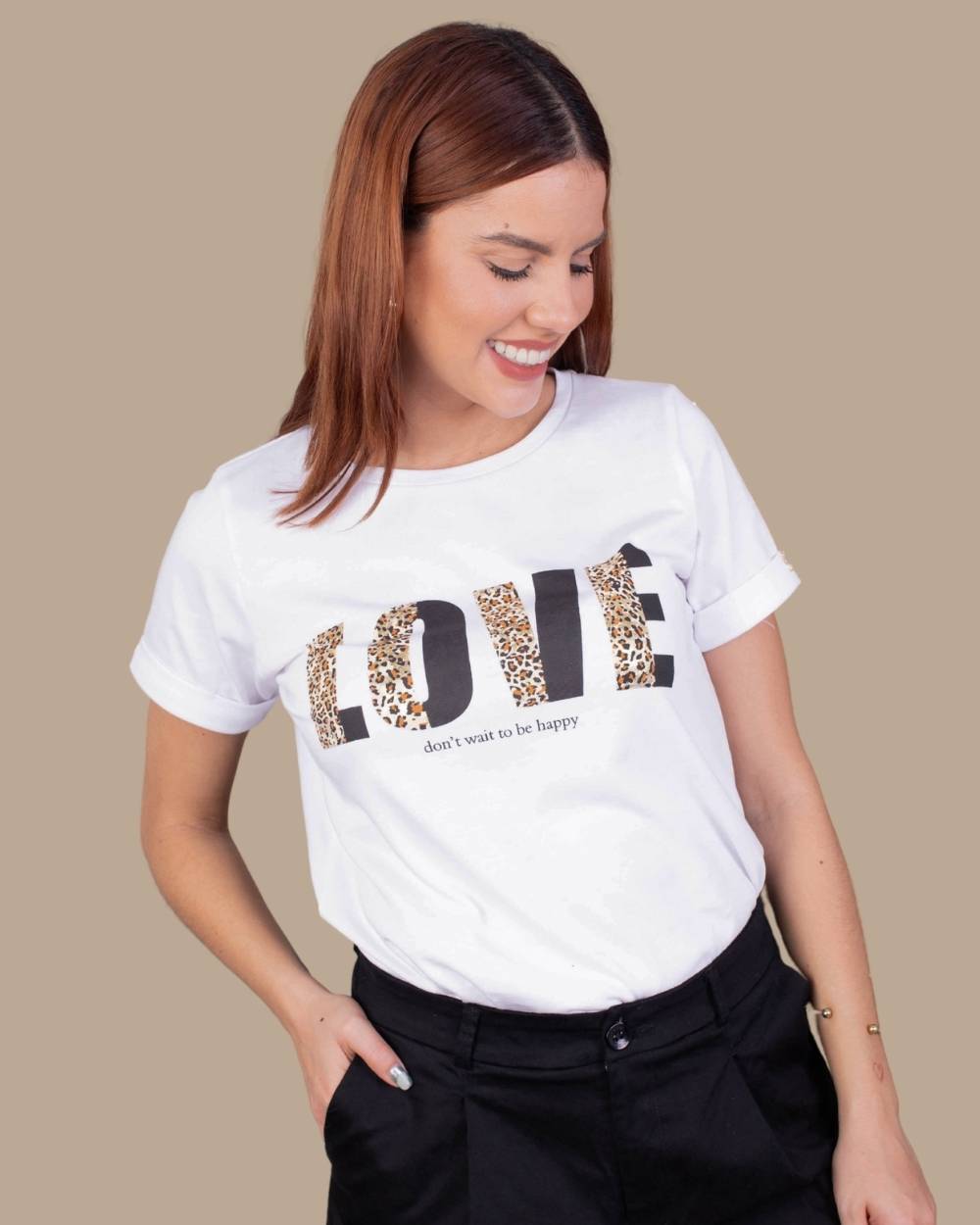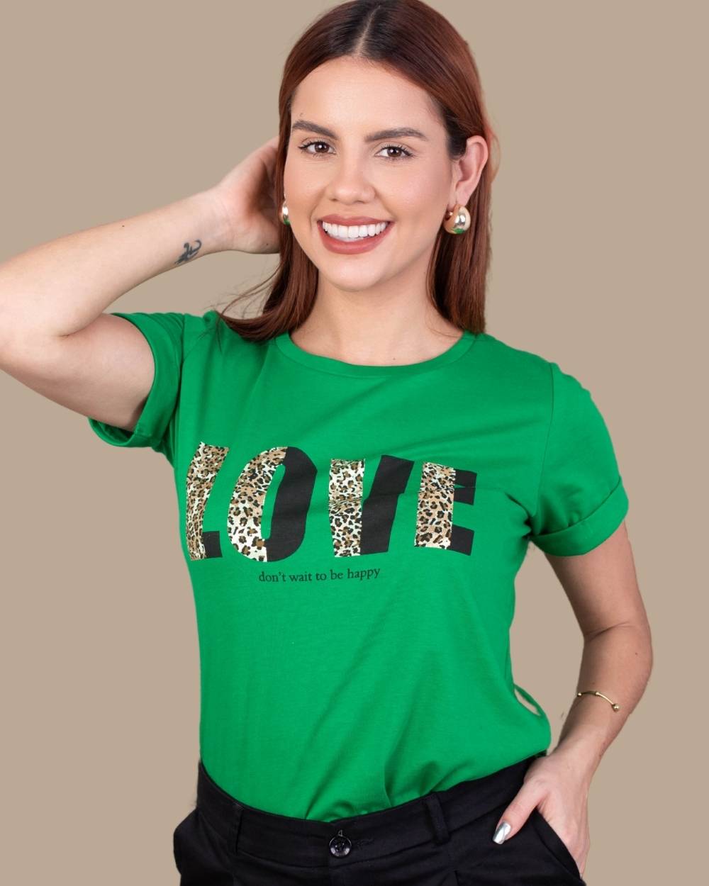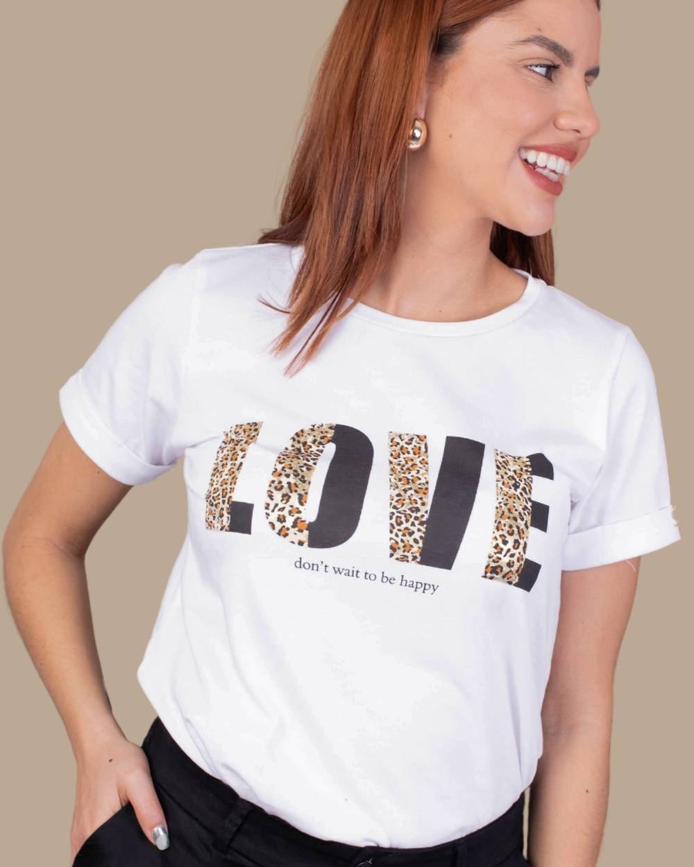 Composición: 100% algodón peruanoFit: Corte clásicoDetalle: Estampado frontal “LOVE” en animal print + logo metálico dorado en mangaCuidados: Lavar a mano o en ciclo delicado. No usar secadora.