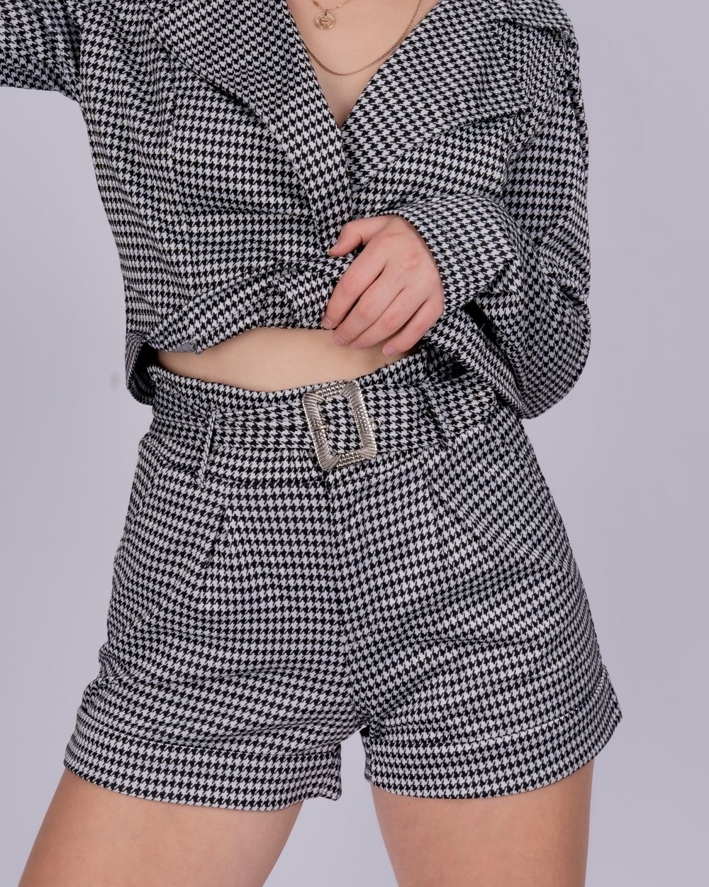 Elaborado en tela ponty roma strecht, con diseño gallineto tejido plano, silueta entallada, Incluye correa.