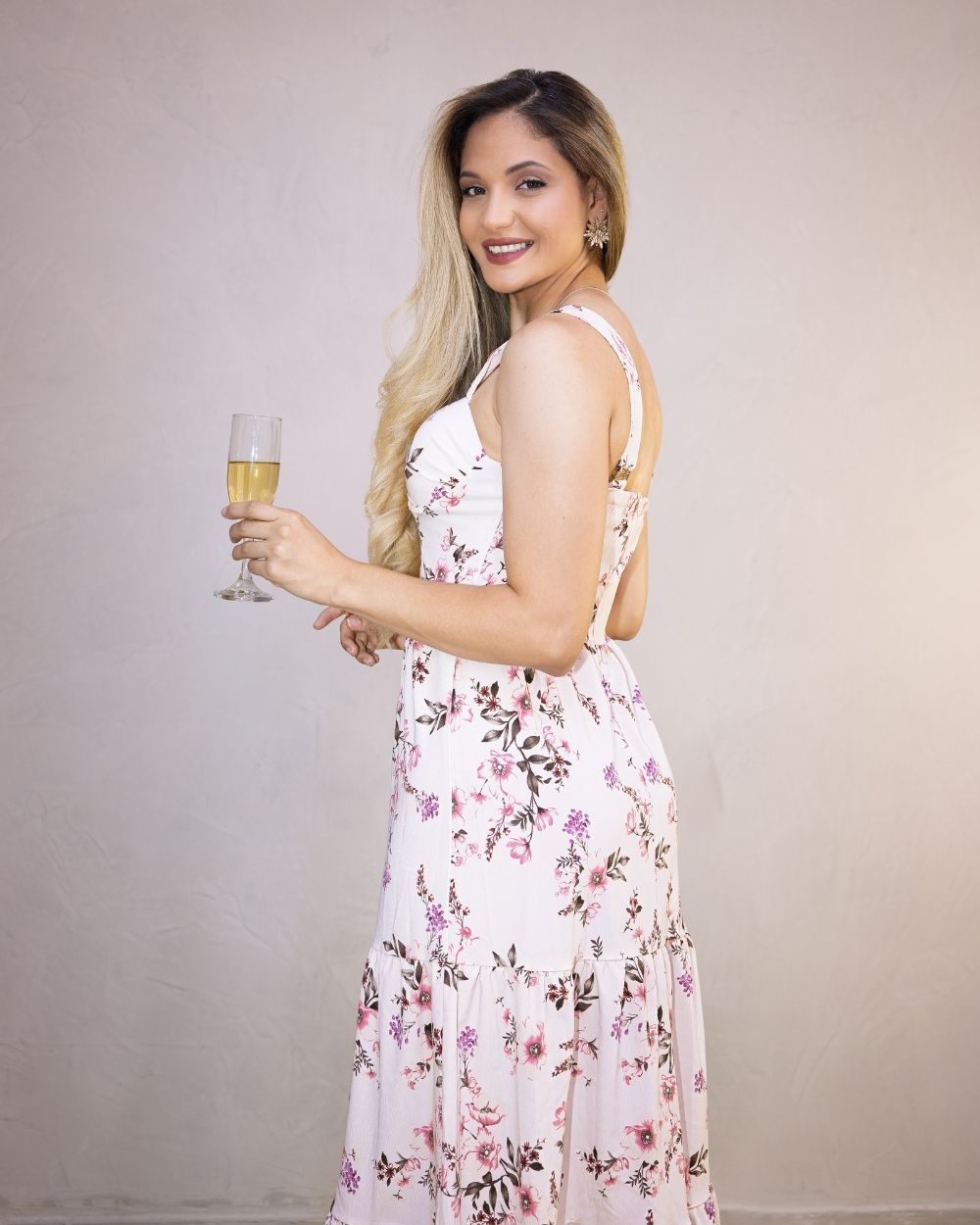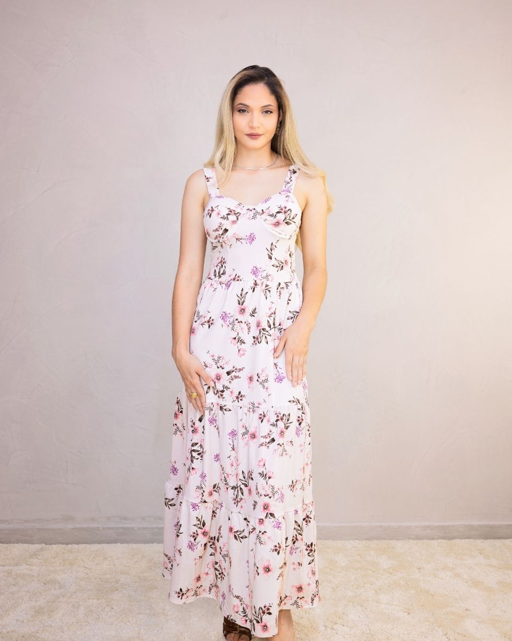 Este vestido largo realza la silueta con una copa push up que define el busto y un faldón en tiempos con sutiles recogidos que aportan movimiento y un aire etéreo. El estampado floral completa un look lleno de vida, suavidad y presencia.